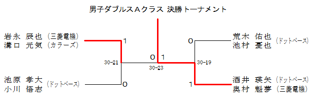 | 男子ダブルスAクラス 1ブロック | 岩永 溝口 | 松浦 比良 | 川崎 横瀬 | 順位 |