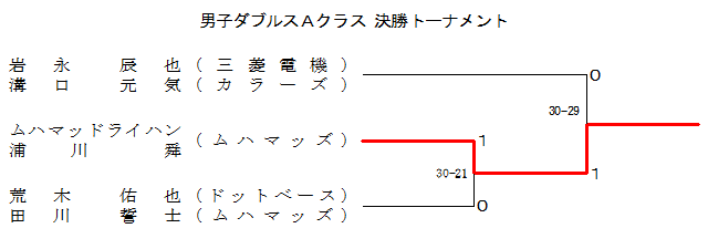 | 男子ダブルスAクラス 2ブロック | 池原 小川 | 河上 比良 | 竹下 宮田 | 鶴田 川口 | ムハマッドライハン 浦川 | 順位 |